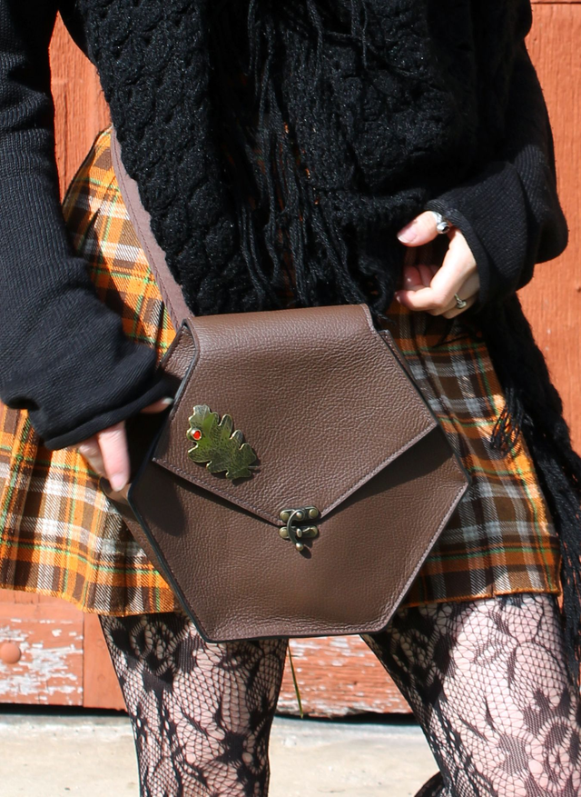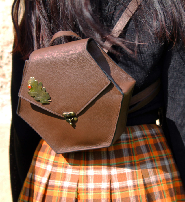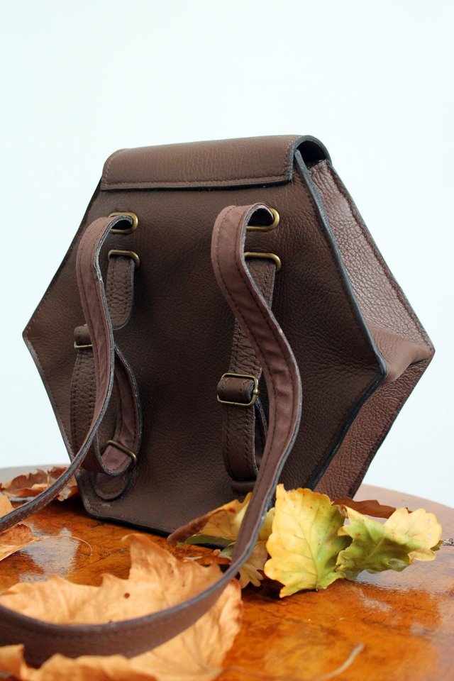 - Un grand sac en cuir bovin brun chocolat, entièrement cousu main, doublé d’un tissu chiné aux couleurs de l’automne.