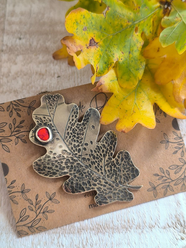 - Un pin’s feuille de chêne en laiton avec incrustation en céramique rouge, fabriqué à la main.