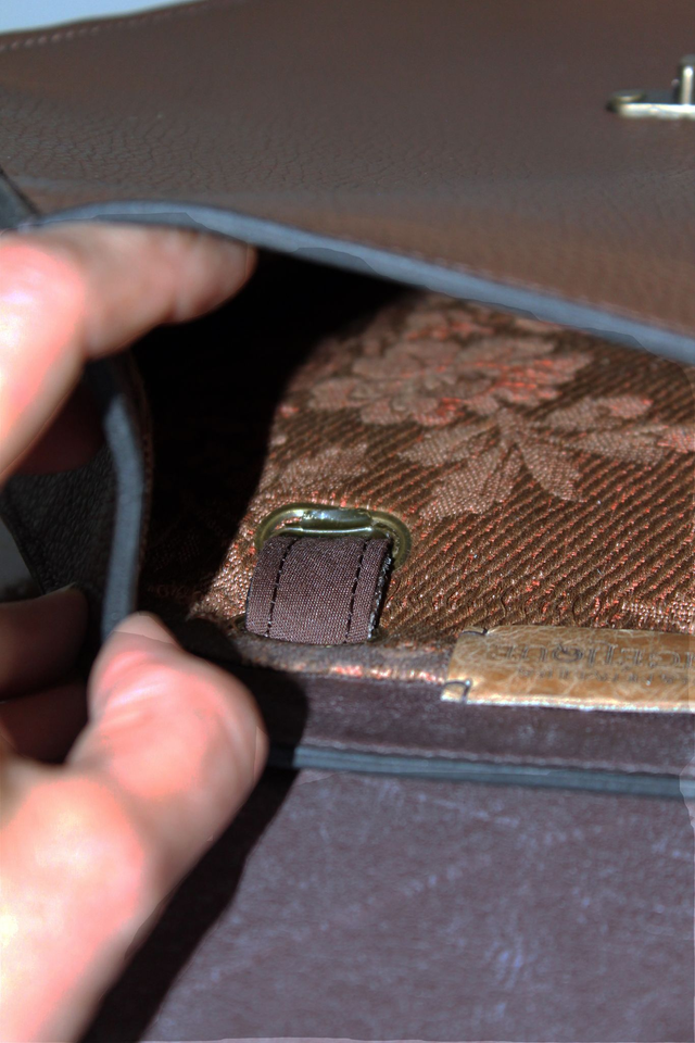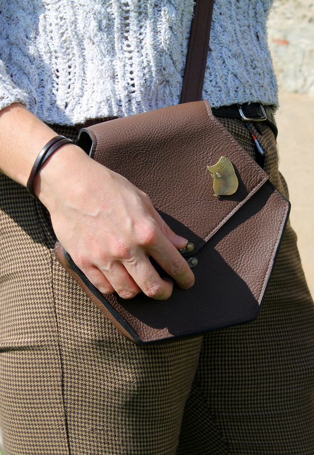 - Un petit sac en cuir bovin brun chocolat, cousu main, doublé d’un tissu chiné aux couleurs de l’automne.