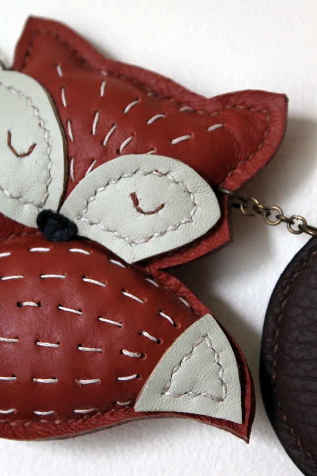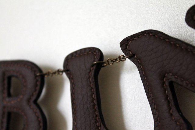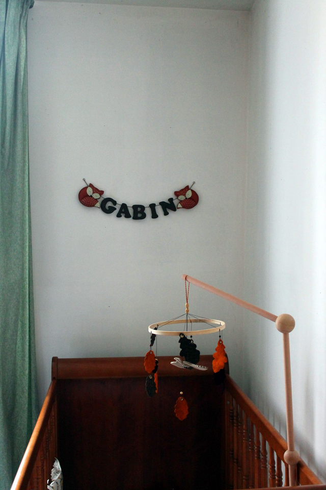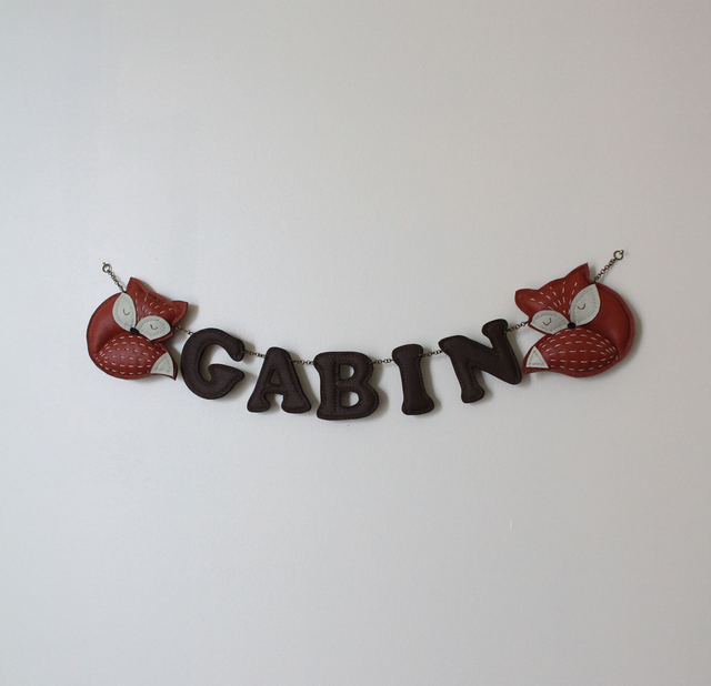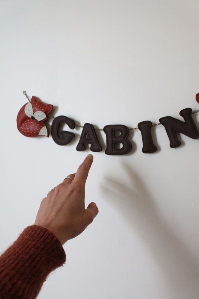 Chaque lettre en cuir bovin brun grainé est renforcée et reliée par une chaînette en laiton. Aux extrémités, deux petits renards en cuir orange et blanc, rembourrés de ouate spéciale enfant, veillent sur le prénom.