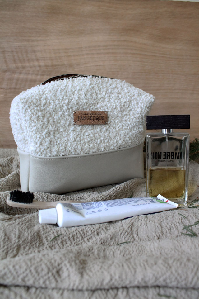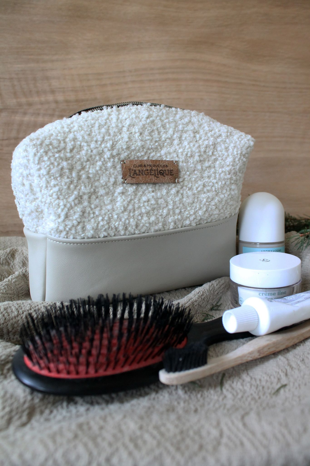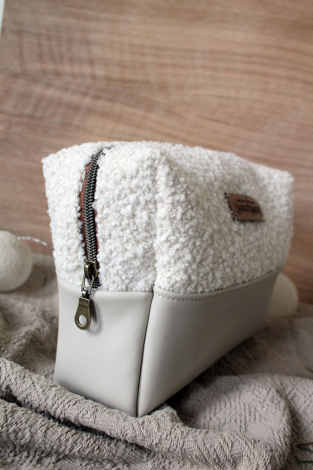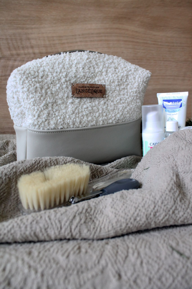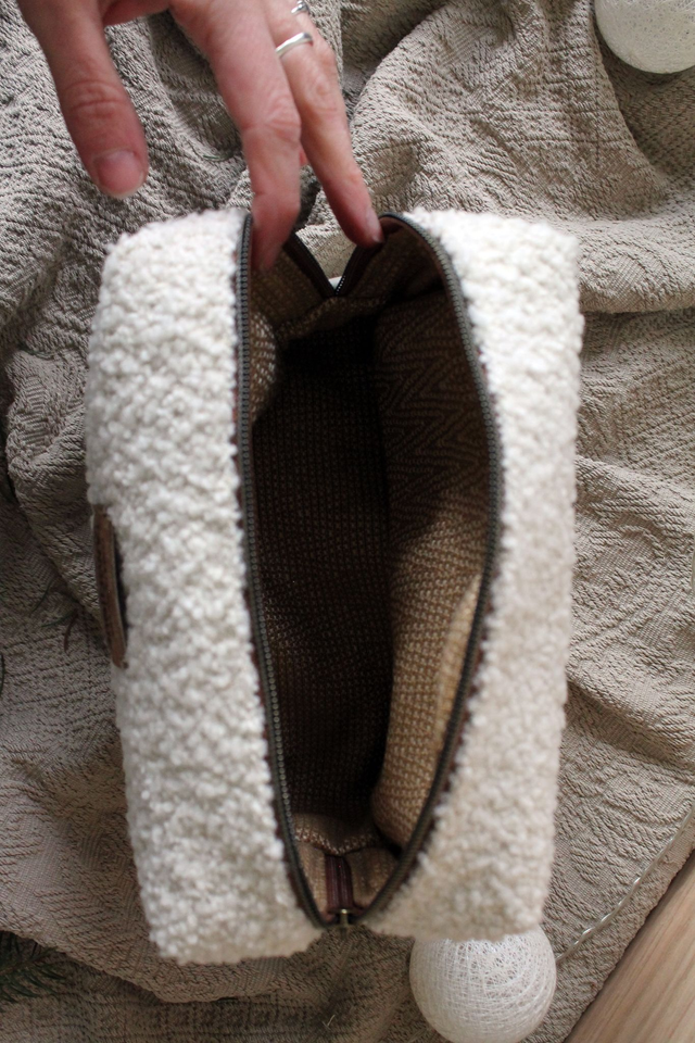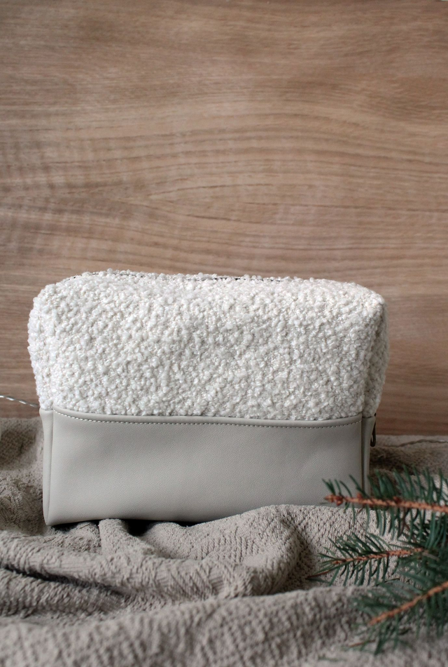 Craque pour cette trousse toute douce mêlant cuir beige lisse et tissu bouclette blanc, comme un cocon hivernal. Son format est idéal pour rassembler les indispensables de maman, papa ou bébé, avec une doublure dorée qui illumine l’intérieur à chaque ouverture.