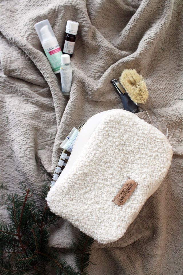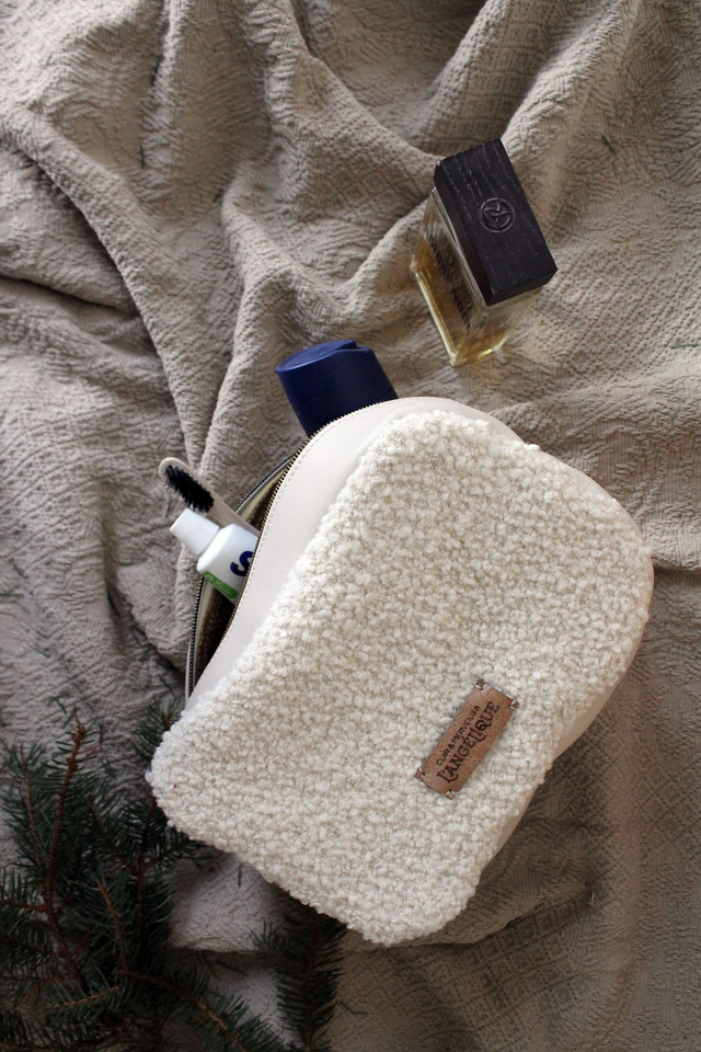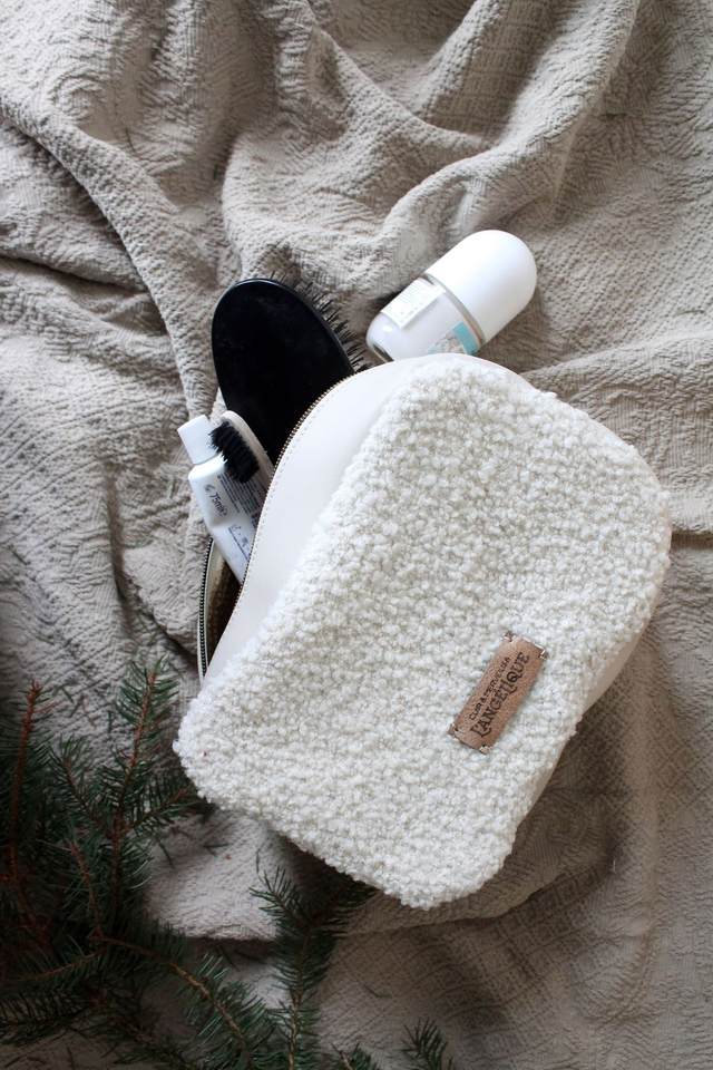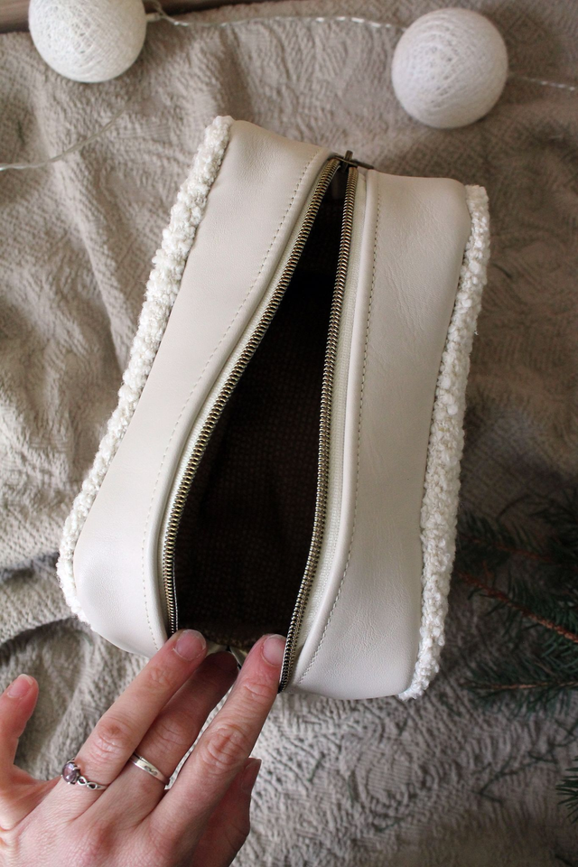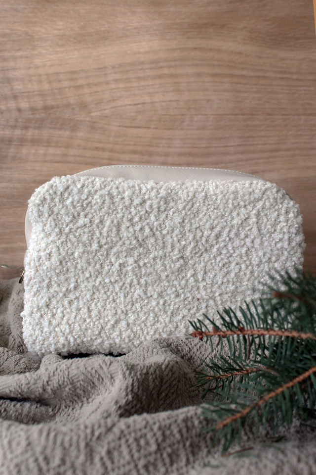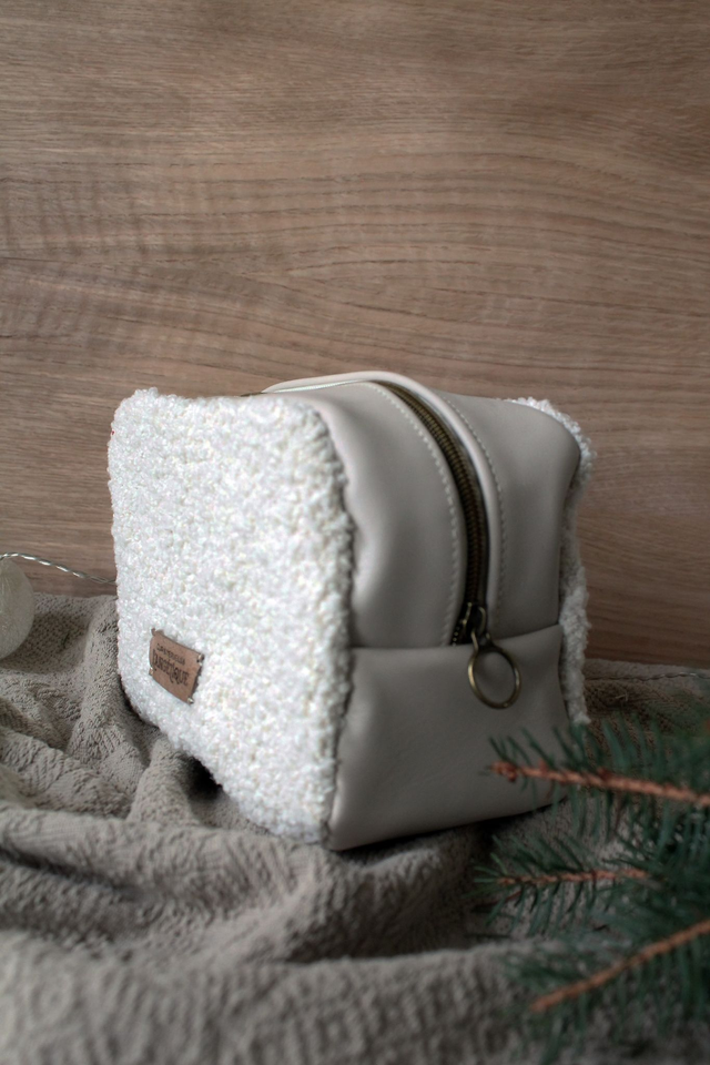 Laisse entrer un peu de douceur givrée avec cette trousse mêlant bouclette blanche et cuir beige lisse. Son toucher réconfortant et son format pratique en font une alliée parfaite pour les affaires de maman, papa ou bébé, le tout avec la lumière subtile de sa doublure dorée.